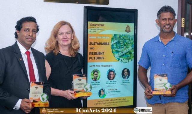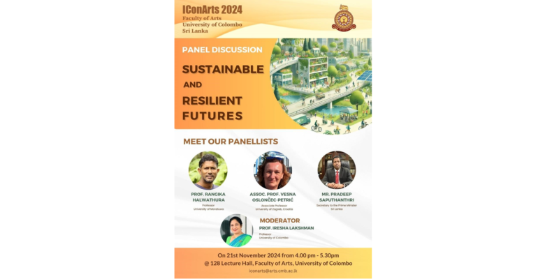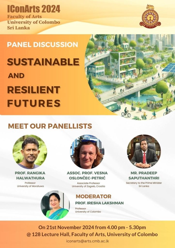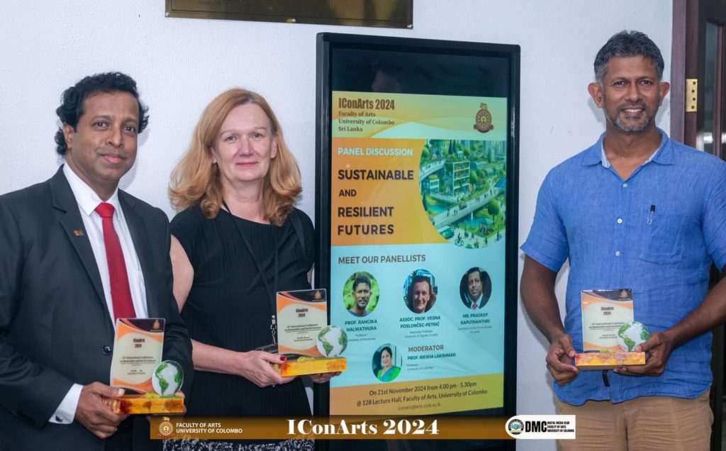 U okviru 10. International Conference of Humanities and Social Sciences – IConArts 2024 održana je panel diskusija na temu održive i otporne budućnosti. Panelisti su bili tajnik premijera Sri Lanke g. Pradeep Sputhanthir, profesor Rangika Halwathura sa Sveučilišta u Moratuwi i izv. profesorica Vesna Poslončec-Petrić, vidi slike. Više o konferenciji na https://arts.cmb.ac.lk/about-symposium-2024/
