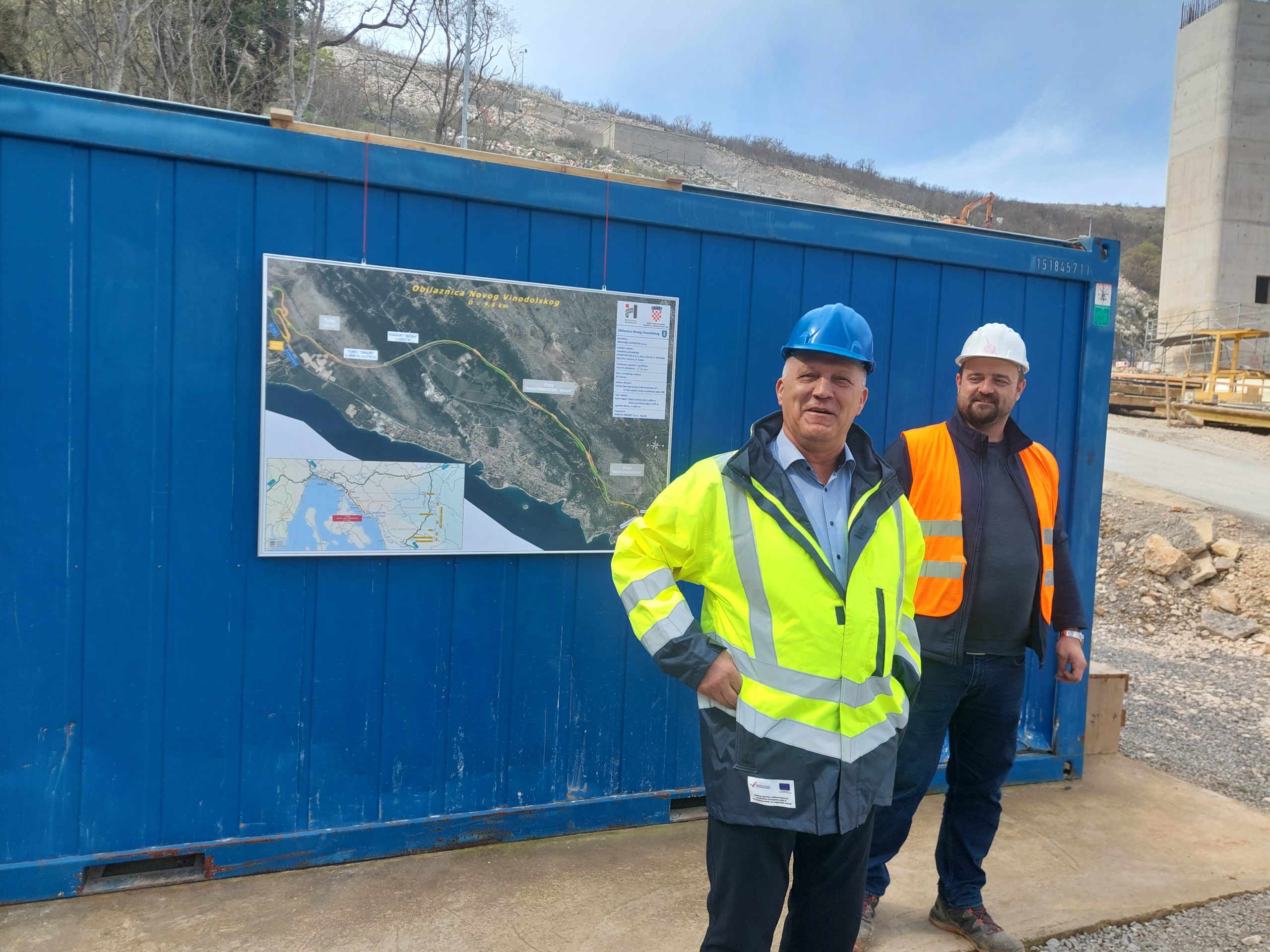 Na gradilištu su nas (uz sunčano vrijeme) dočekali i geodetski nadzorni inženjeri dipl. ing. geod. Marko Zrakić i dipl. ing. Dejan Savić iz tvrtke Trafficon d.o.o. iz Zagreba. Nažalost, zbog sastanka nisu nam se uspjeli pridružiti ostali inženjeri s gradilišta koji su nam mogli upotpuniti priču iz perspektive svojih struka. Nakon opremanja sigurnosnom opremom i kratkih uputa o ponašanju na gradilištu, uputili smo se na prvu postaju, preglednu kartu projekta. Do tamo nas je vodio strmi uspon koji smo lako savladali diveći se impozantnim stupovima budućeg vijadukta Ričina te škicajući stupove geodetske mreže posebne namjene bez kojih ništa ne bi bilo moguće (ali to samo mi geodeti znamo).