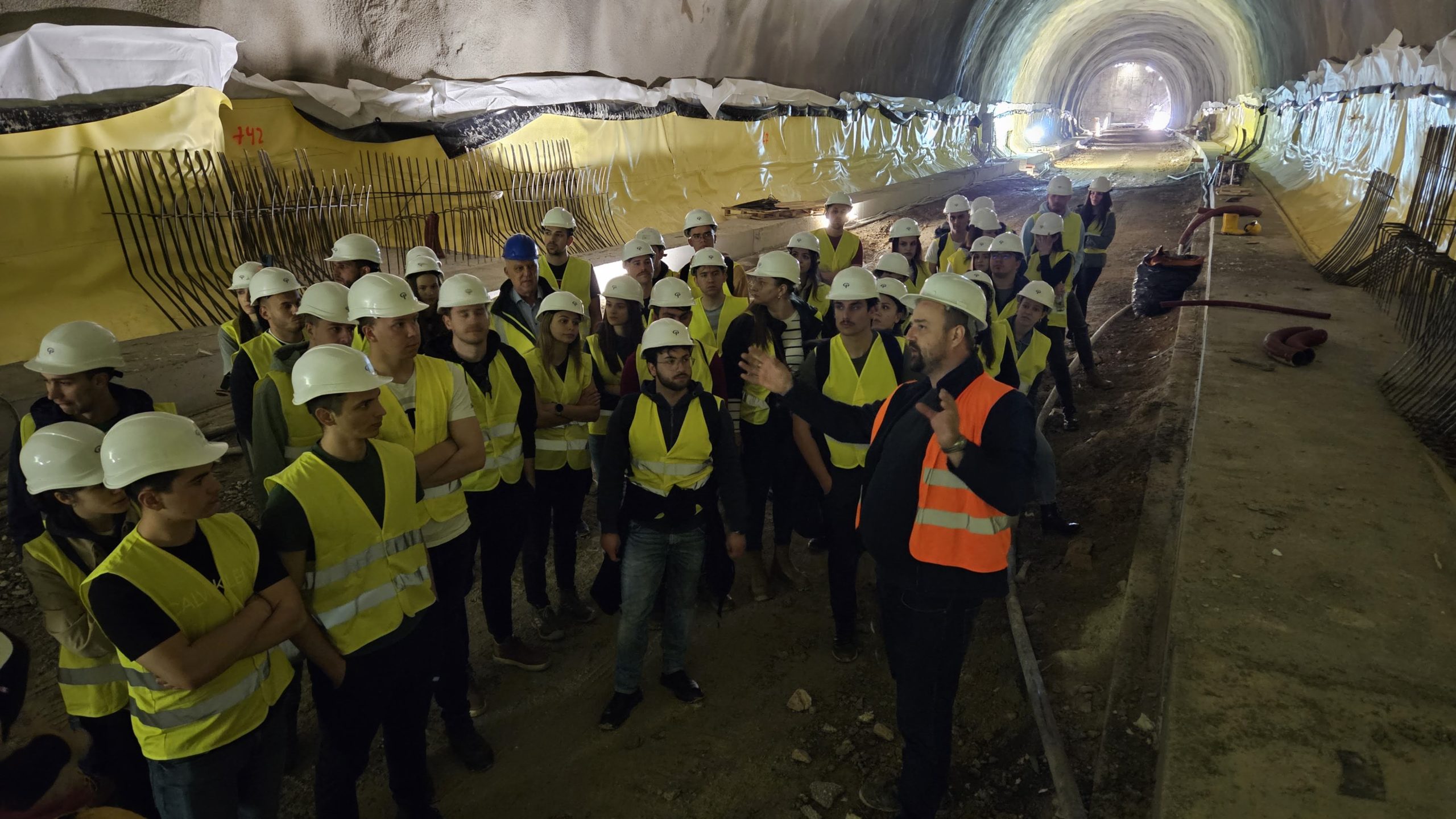 Gospodin Zrakić nam je prezentirao projekt dovršetka autoceste A7 te izgradnju obilaznice Novog Vinodolskog kao prvi korak u tome, a zatim je detaljno ispričao koji su geodetski radovi prethodili izradi svih faza projekata kao i radovi prilikom izvedbe projekta. Nakon uvoda zaputili smo se još strmijom cestom do istočnog portala tunela Zagori. Tunel Zagori sastoji se od dvije tunelske cijevi koje su probijene u rujnu prošle godine. U trenutku posjeta u sjevernoj cijevi kojom će prolaziti obilaznica izvodili su se građevinski radovi postavljanja oplata i betoniranja, dok južna cijev u ovom trenutku služi kao servisni tunel, ali će u budućnosti postati dio autoputa. Naši domaćini su nam detaljno ispričali koje poslove obavljaju geodeti u tunelu, na koji način, kojom opremom te u kakvim (zahtjevnim) uvjetima.