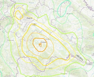 Slika 1. Karta podrhtavanja površine tla za vrijeme glavnog potresa u Petrinji (29. prosinca 2020. u 12:19) izraženo vrijednostima horizontalnih vršnih ubrzanja tla u postocima ubrzanja sile teže [URL 1]