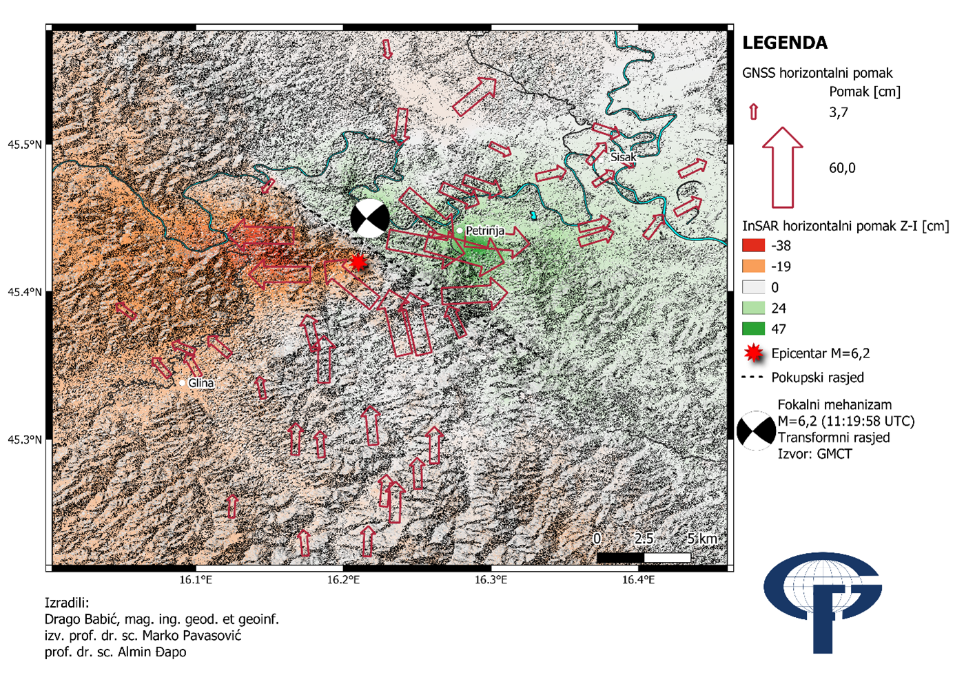 Na Geodetskom fakultetu Sveučilišta u Zagrebu je dan nakon potresa napravljena preliminarna analiza površinskih pomaka koristeći podatke satelitske misije Sentinel-1 i dobiveno je da se zapadno krilo rasjeda pomaklo cca 35 cm u smjeru sjeverozapad, a istočno krilo rasjeda cca 28 cm u smjeru jugoistok. Ovaj rezultat u skladu je s mehanizmom pomaka u žarištu potresa. Prvi preliminarni rezultati objavljeni su na službenim stranicama Geodetskog fakulteta [URL 2].
