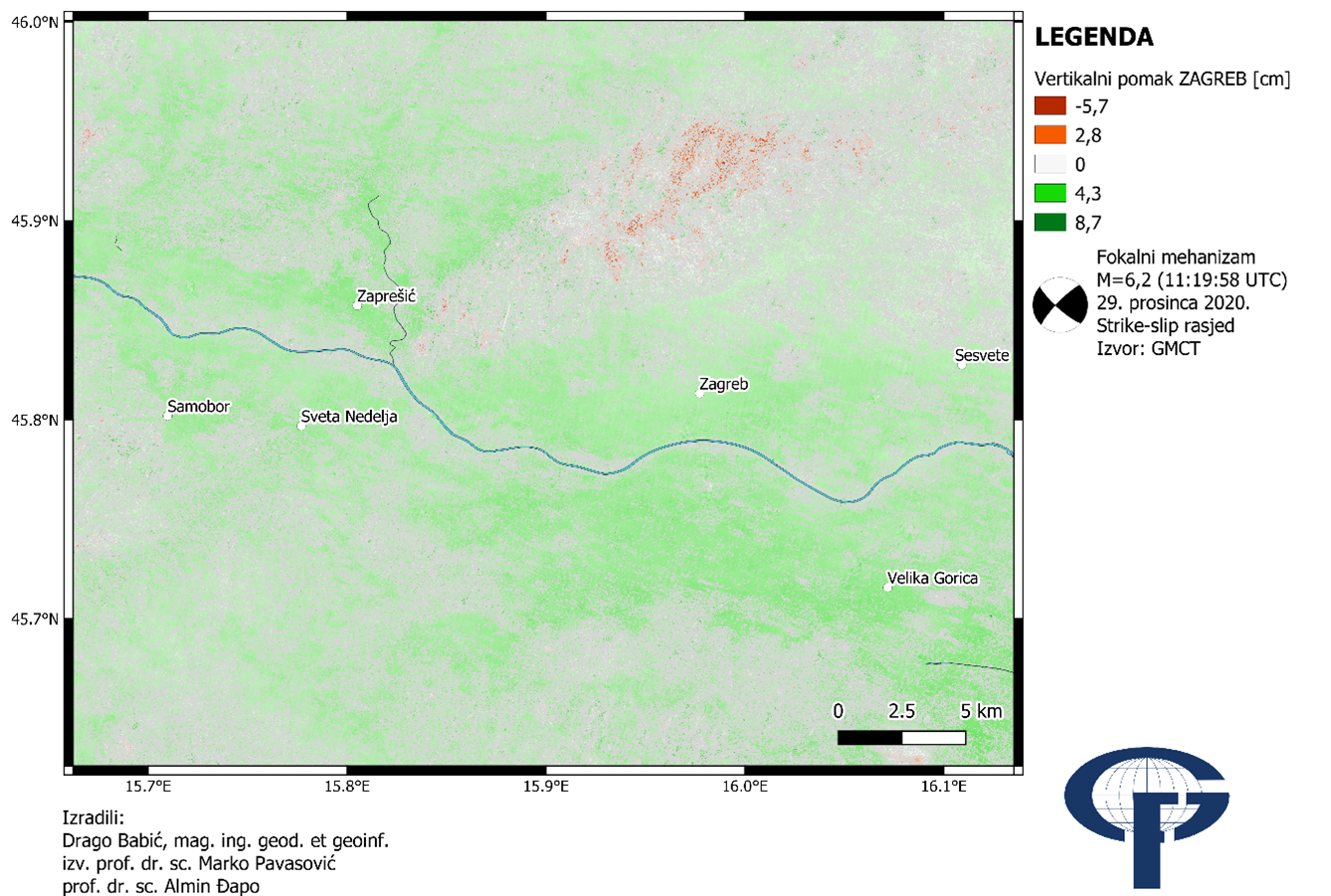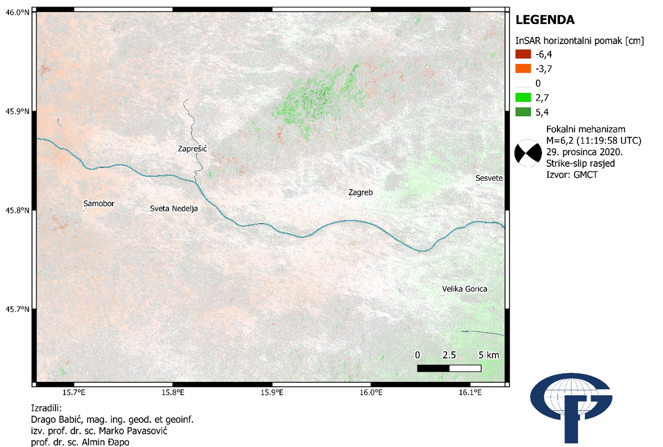 Na slici 5 prikazani su pomaci dobiveni satelitskom radarskom interferometrijom (InSAR) u smjeru zapad-istok, dok slika 6 prikazuje pomake u vertikalnom smjeru. Dobiveni pomaci u horizontalnom smjeru su od 6,4 cm prema zapadu do 5,4 cm prema istoku te od -5,7 cm do 8,7 cm u vertikalnom smjeru. Evidentno je da je Petrinjski potres prouzročio signifikantne pomake Zemljine kore ne samo na Petrinjskom području već i na širem zagrebačkom području.