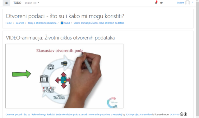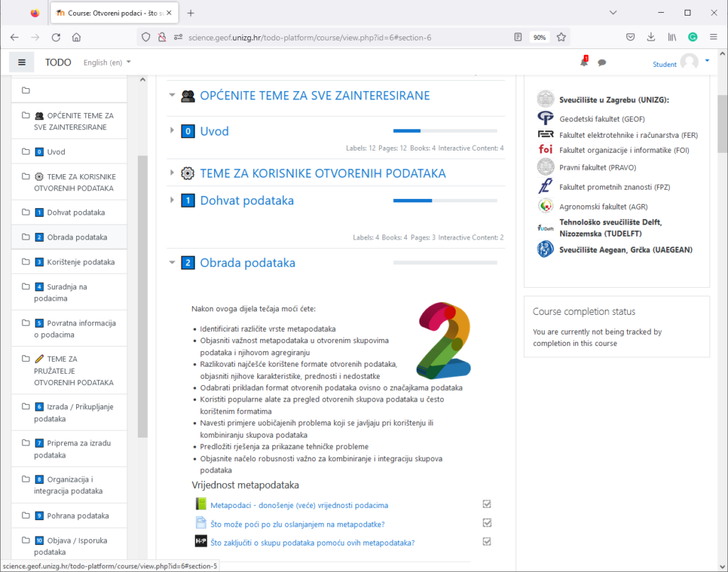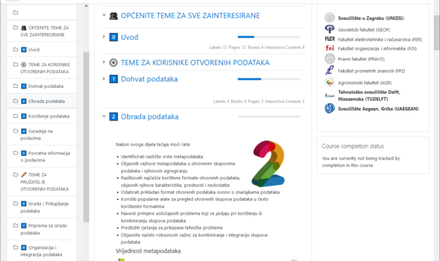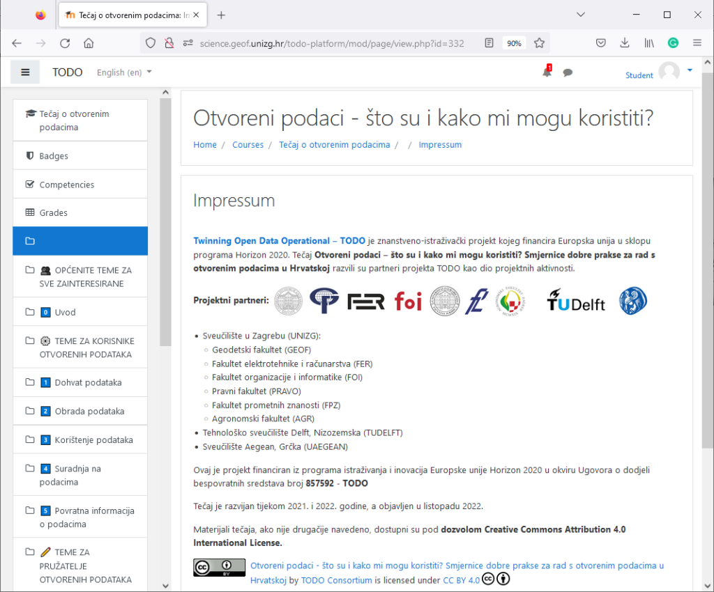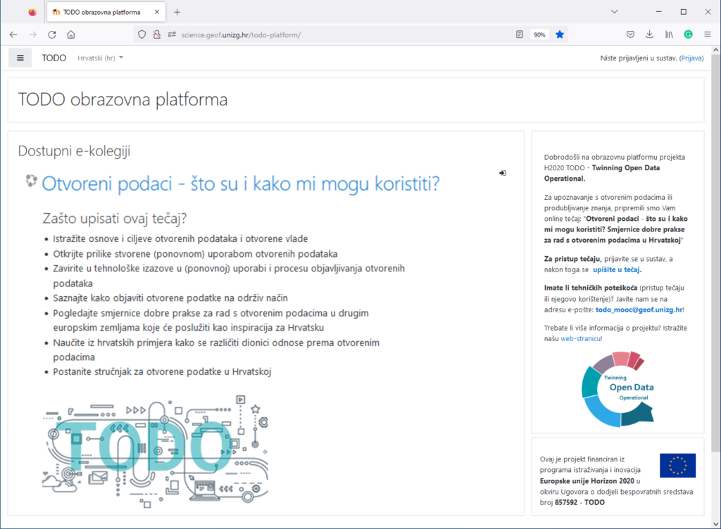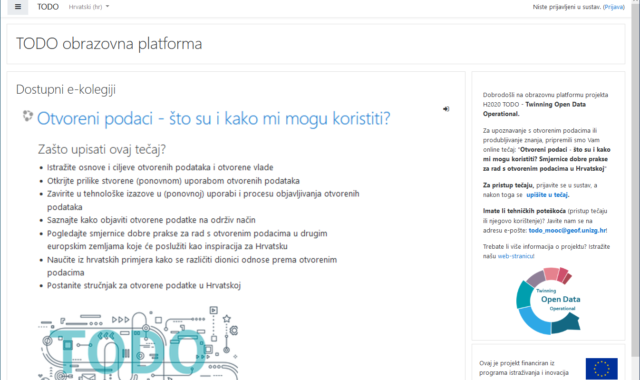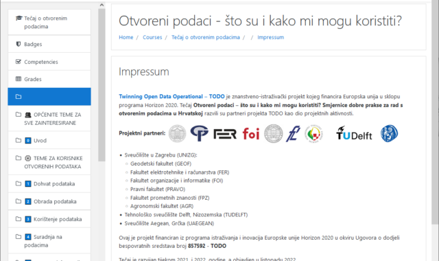 U sklopu projekta “Twinning Open Data Operational” (H2020 TODO, https://todo-project.eu) kojeg koordinira Geodetski fakultet, razvijen je i objavljen besplatni, otvoreni e-tečaj na hrvatskom jeziku o otvorenim podacima: “Otvoreni podaci – što su i kako mi mogu koristiti? Smjernice dobre prakse za rad s otvorenim podacima u Hrvatskoj”.