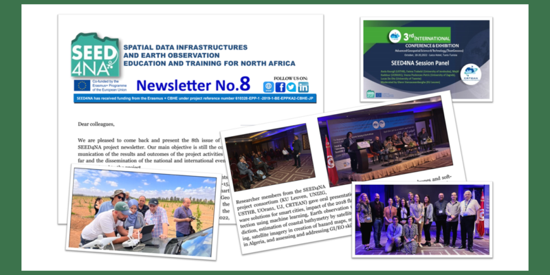 Sa zadovoljstvom predstavljamo 8. broj elektronskih novina SEED4NA projekta. U ovom broju donosimo informacije o projektnim aktivnostima u proteklom periodu gdje izdvajamo projektni sastanak u Agadiru (Maroko), sudjelovanje na TeanGeo konferencija 2022. u Tunisu (Tunis) te prilog o četverodnevnom treningu za djelatnike, studente, doktorske studente i goste Fakulteta elektrotehnike Sveučilišta znanosti i tehnologije Houari Boumedienne u Alžiru (Faculté de Génie Electrique, Université des Sciences et de Technologie Houari Boumediene). Trening su održali djelatnici Geodetskog fakulteta Sveučilišta u Zagrebu prof. dr. sc. Željko Bačić, izv. prof. dr. sc. Andrija Krtalić, izv. prof. dr. sc. Vesna Poslončec-Petrić te kolega dr. sc. Marijan Grgić, Meixner Vermessung ZT GmbH, Beč, Austrija.